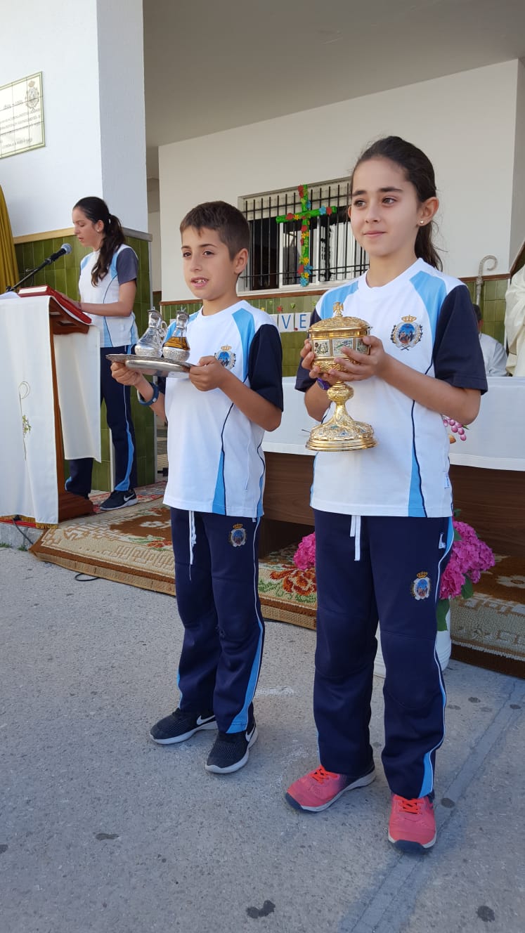 En la celebración han participado miembros de la comunidad educativa: todos los alumnos del colegio, profesores, religiosas de la comunidad de Sanlúcar de Bda., profesoras jubiladas y una representación de padres.