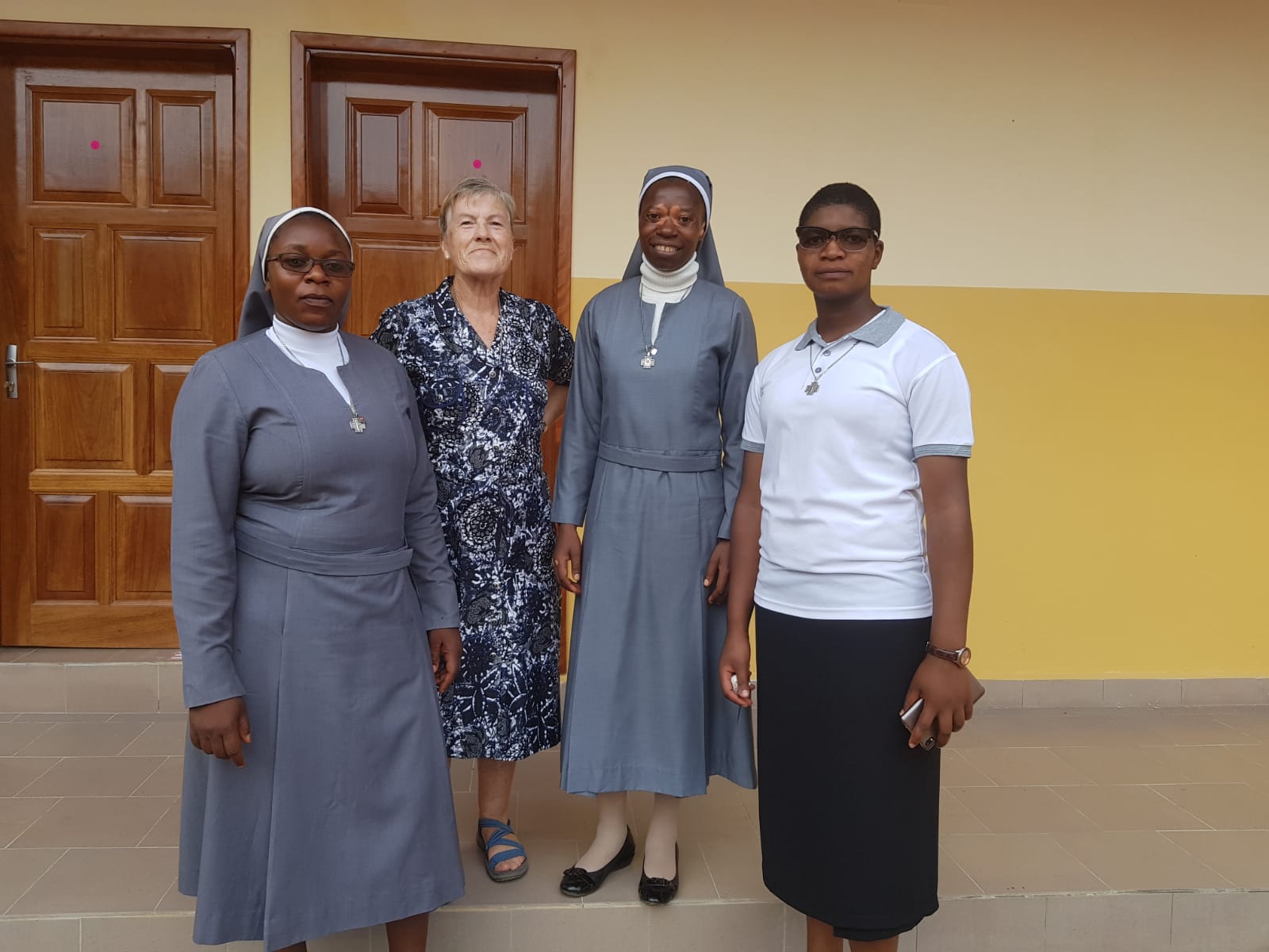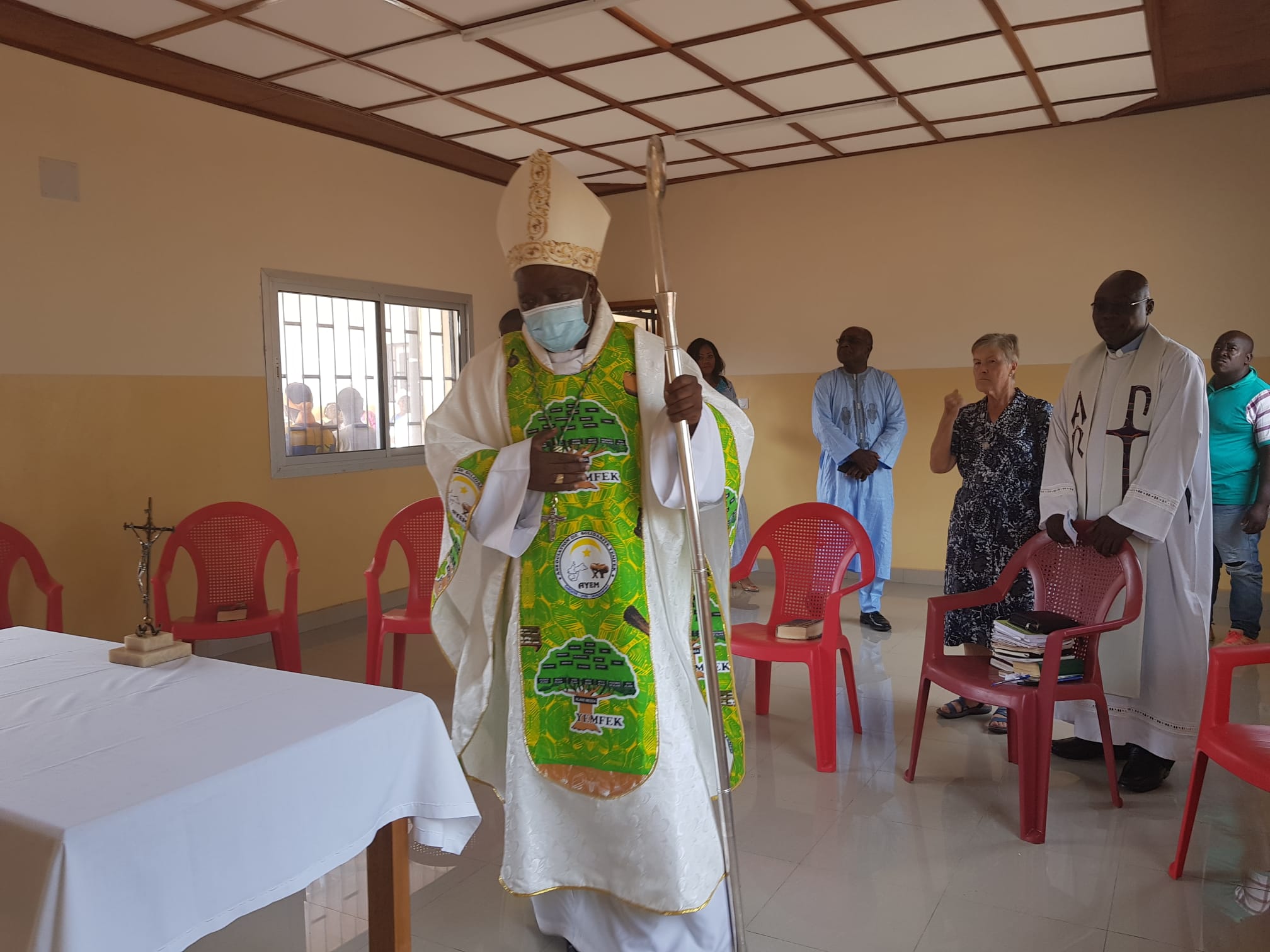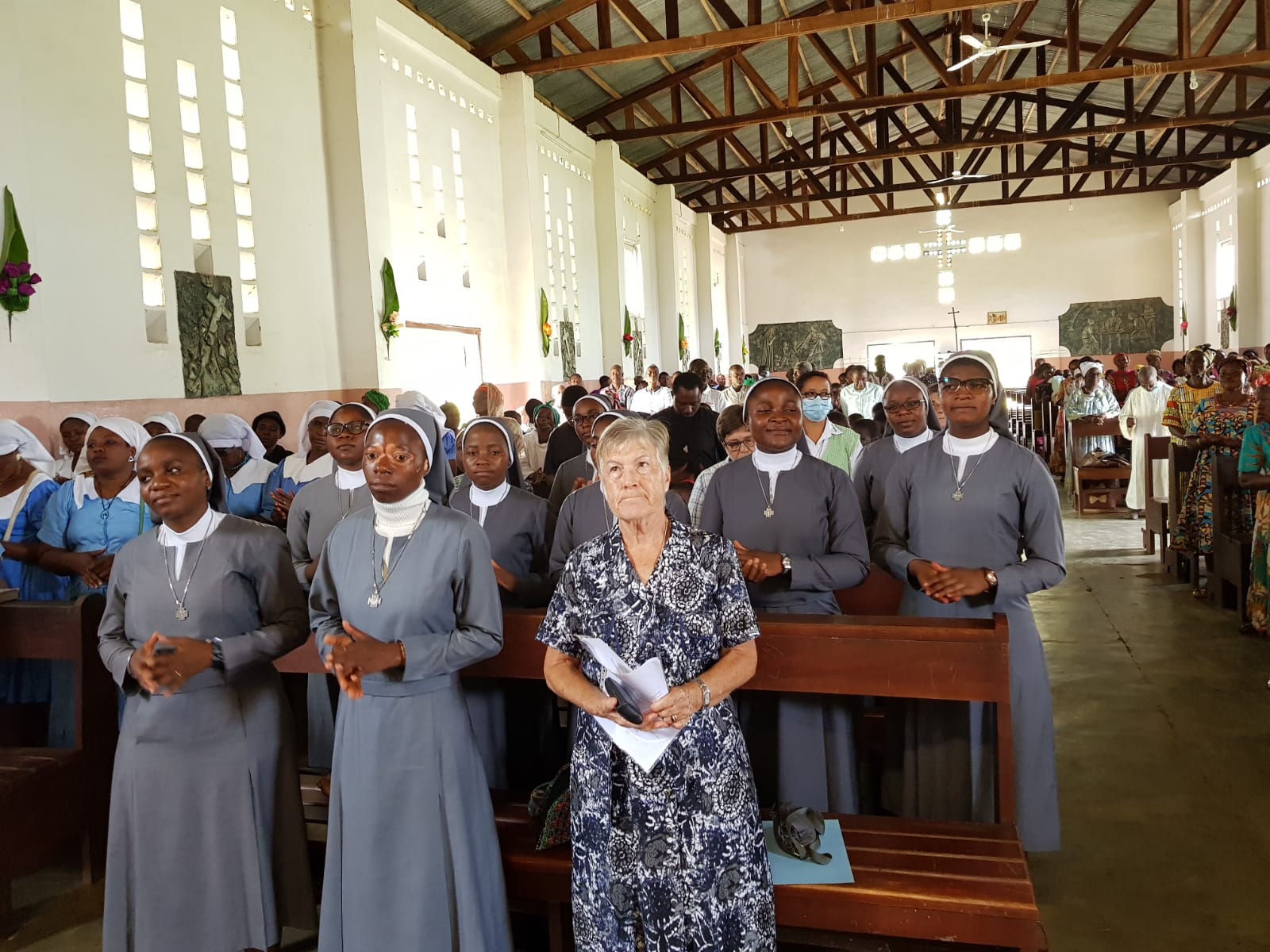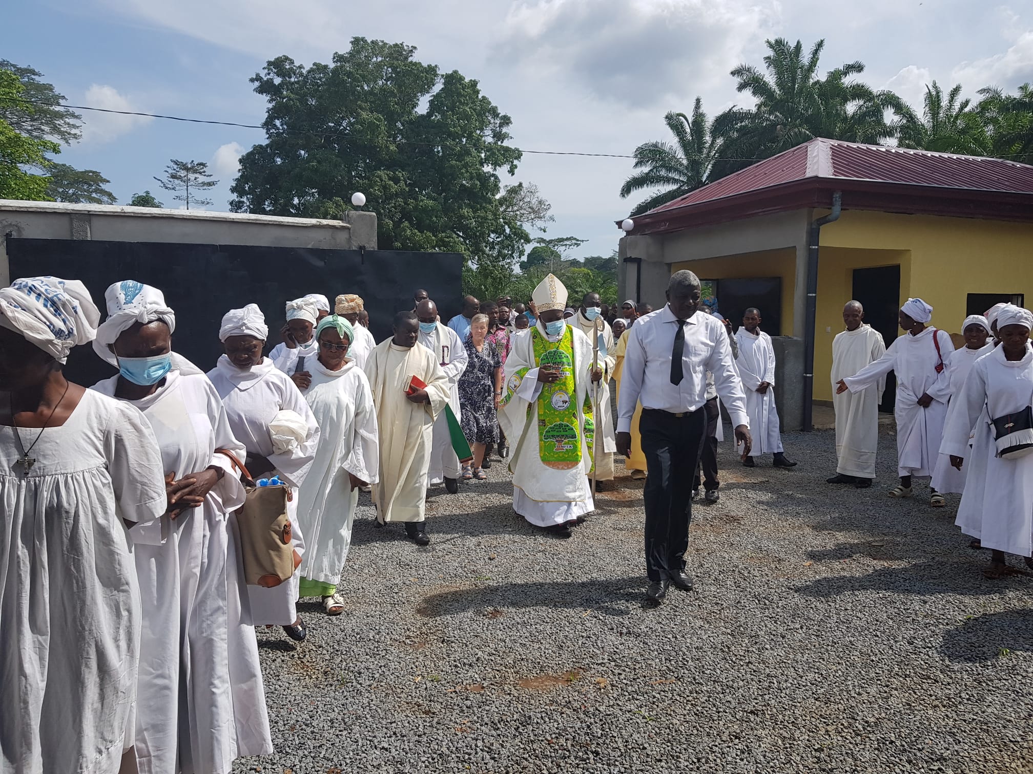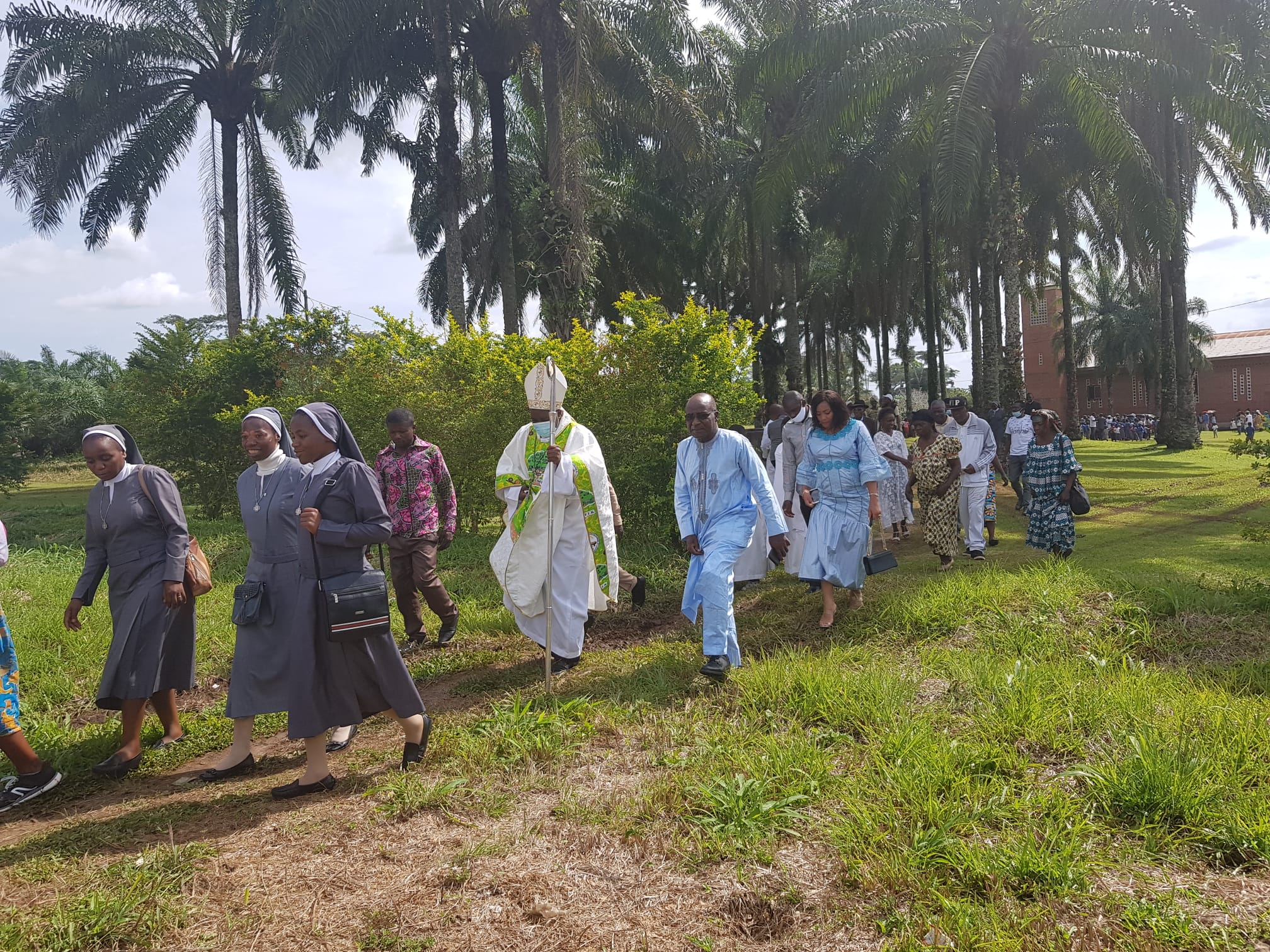La solemne Eucaristía ha sido presidida por el señor obispo de Sangmélima Christophe Zoa, quien presentó a las hermanas que constituyen la nueva comunidad: M. Carmen Vallejo, superiora, y las junioras Mary Kinyuy, Cynthia Kika Berinyuy y Fumbui Robine Ankungha; concelebró el párroco de Nkolekong, el P. Evaristus Aken, provincial de los Escolapios de África Central, el P. Paulinus Abose, formador de los teólogos escolapios, y el P. Landry Ndo párroco de Efulan. Acompañaron la celebración los profesores de la escuela, familias, niños, y algunas autoridades quienes dieron la bienvenida a las hermanas, muy agradecidos porque en el sector no hay ninguna comunidad religiosa. Por supuesto, también estuvieron presentes las hermanas de la comunidad de Yaoundé, y además, las 5 religiosas de la comunidad hermanas de Notre Dame de la Compasión y una Esclava del Sagrado Corazón.