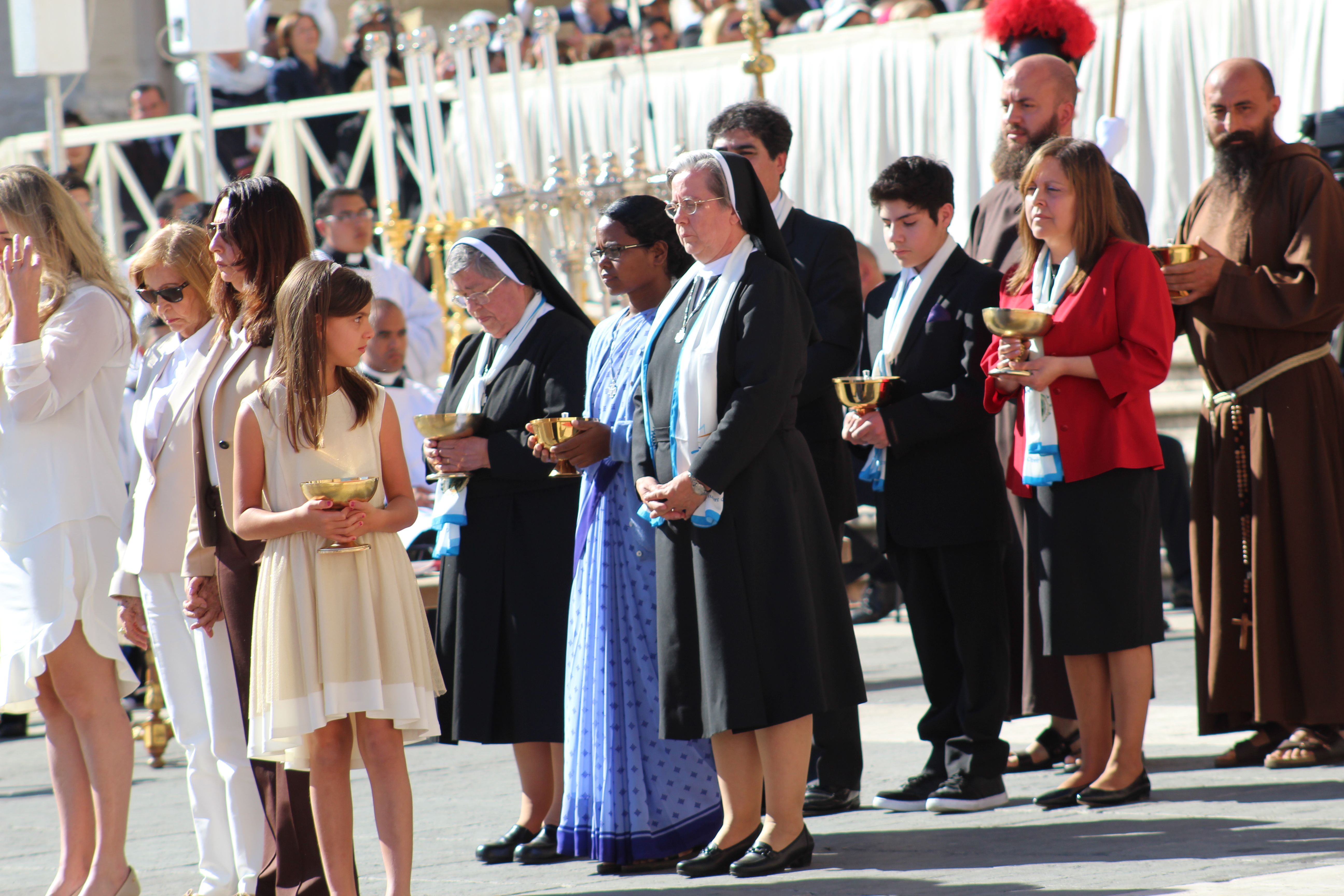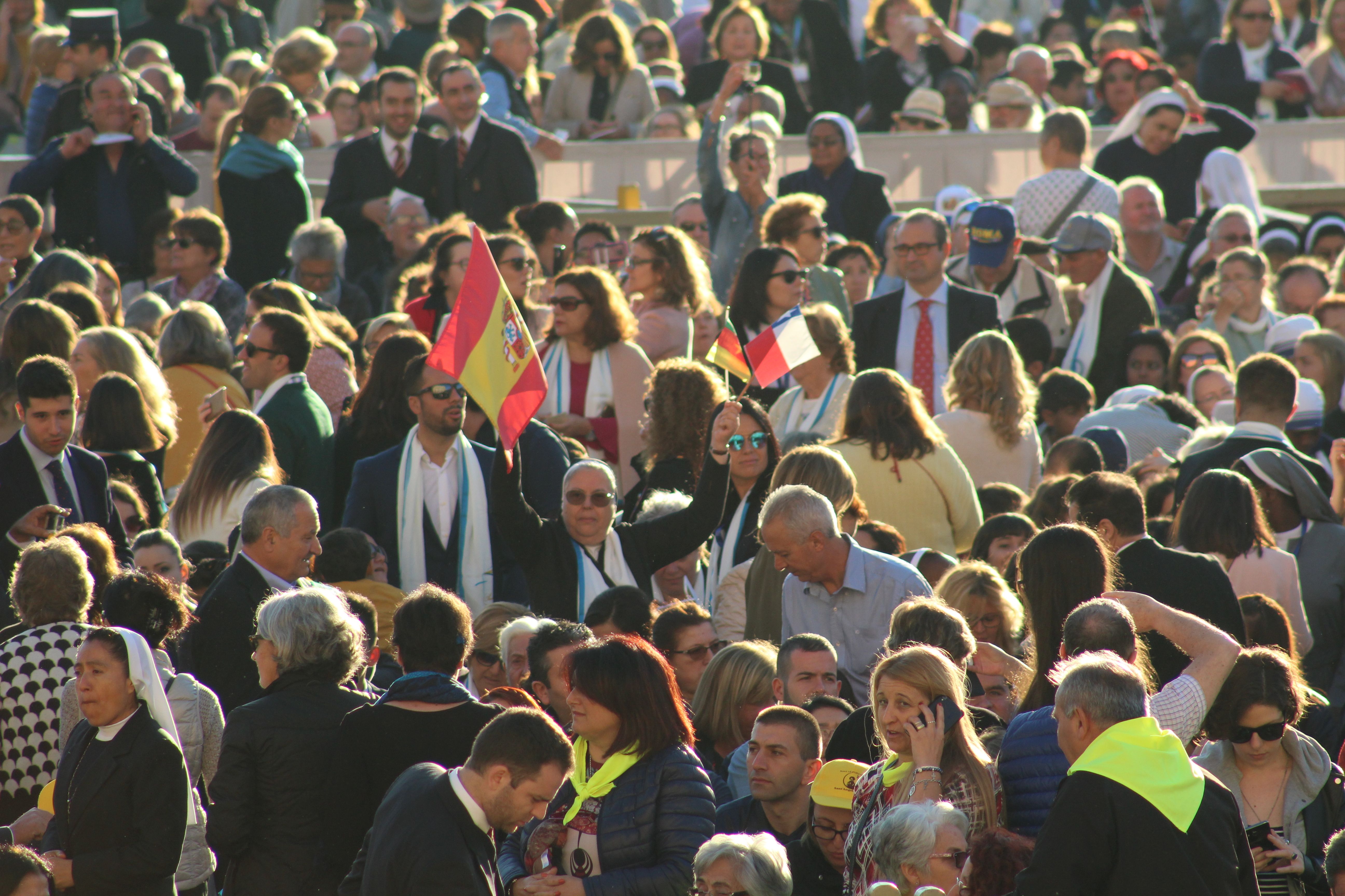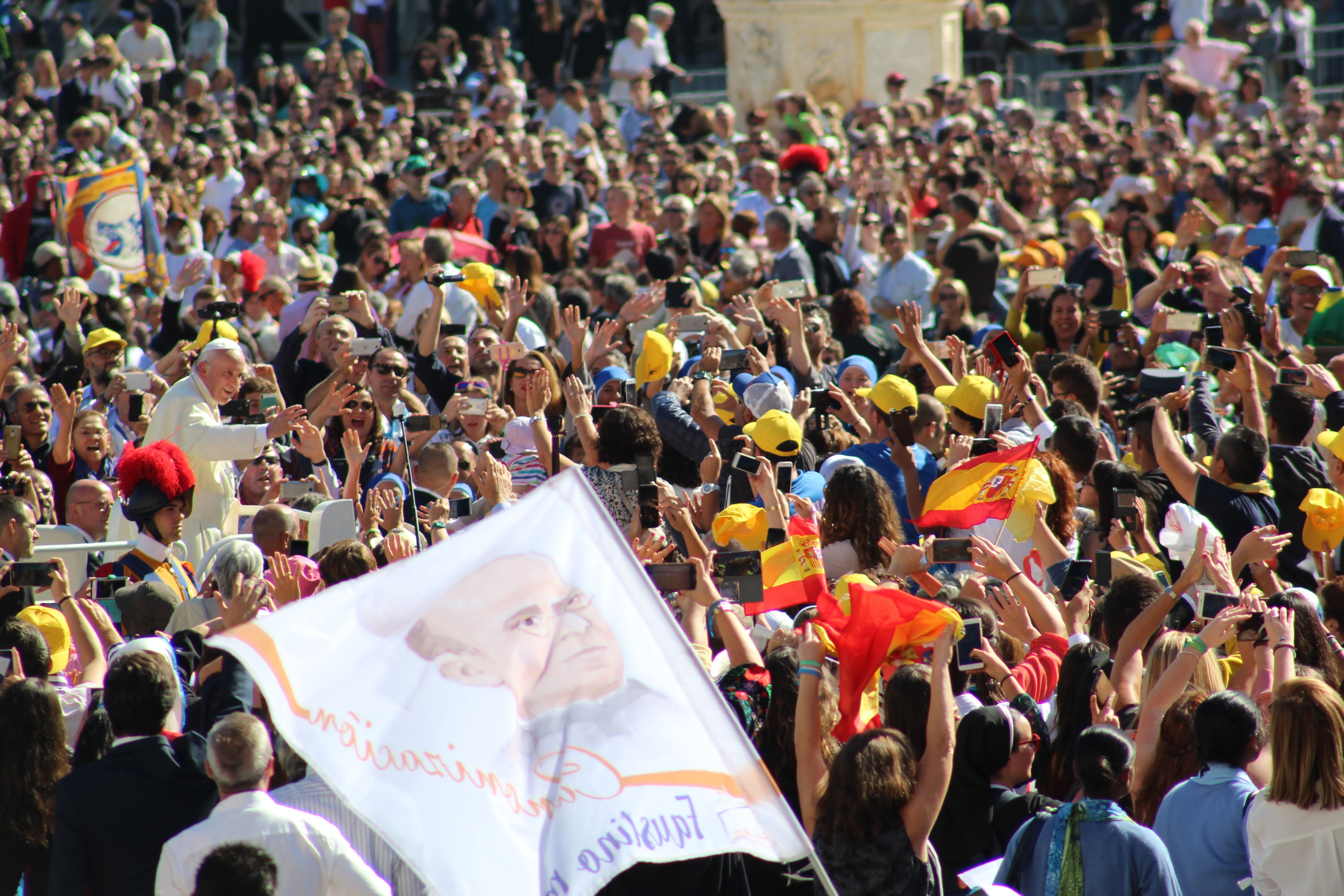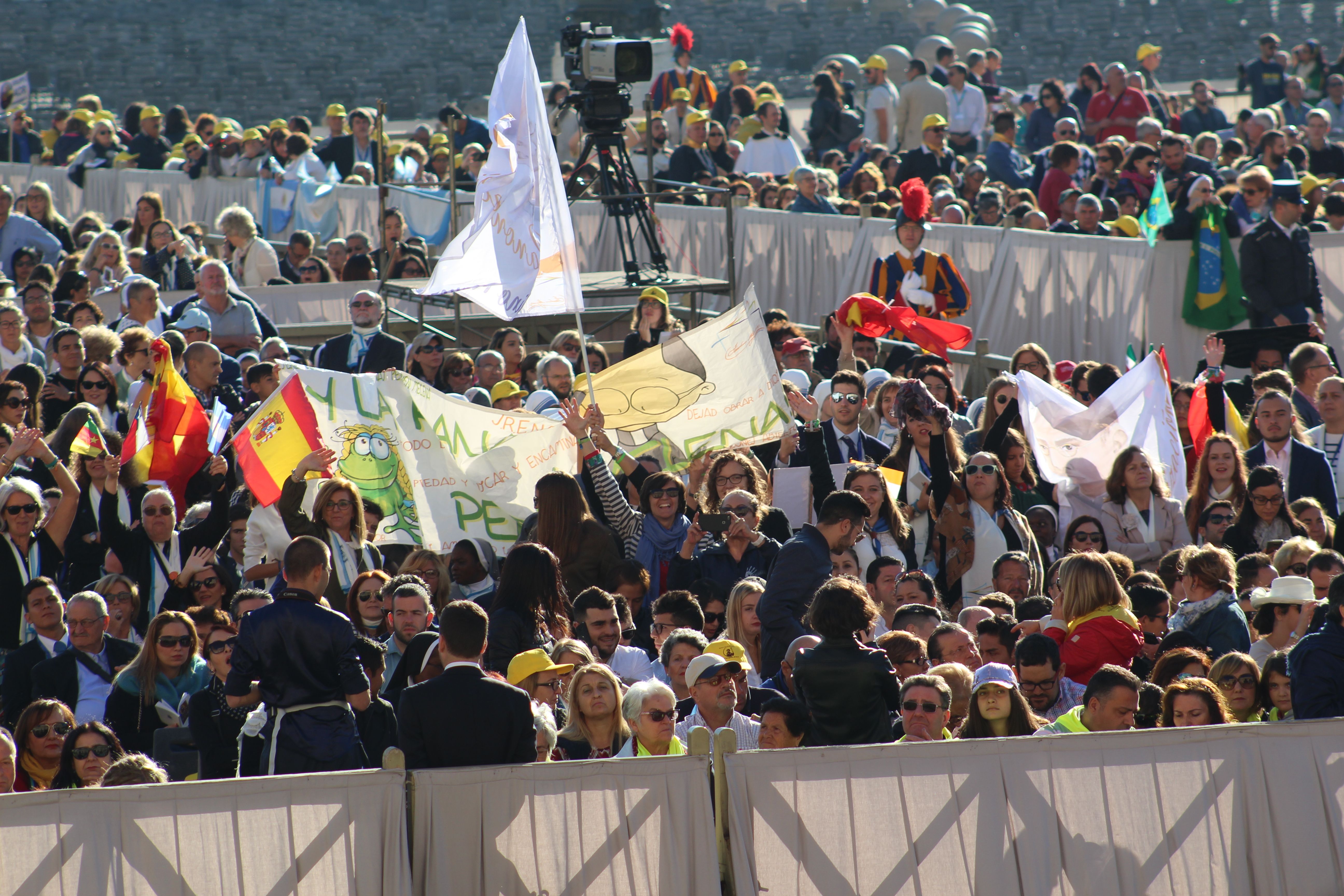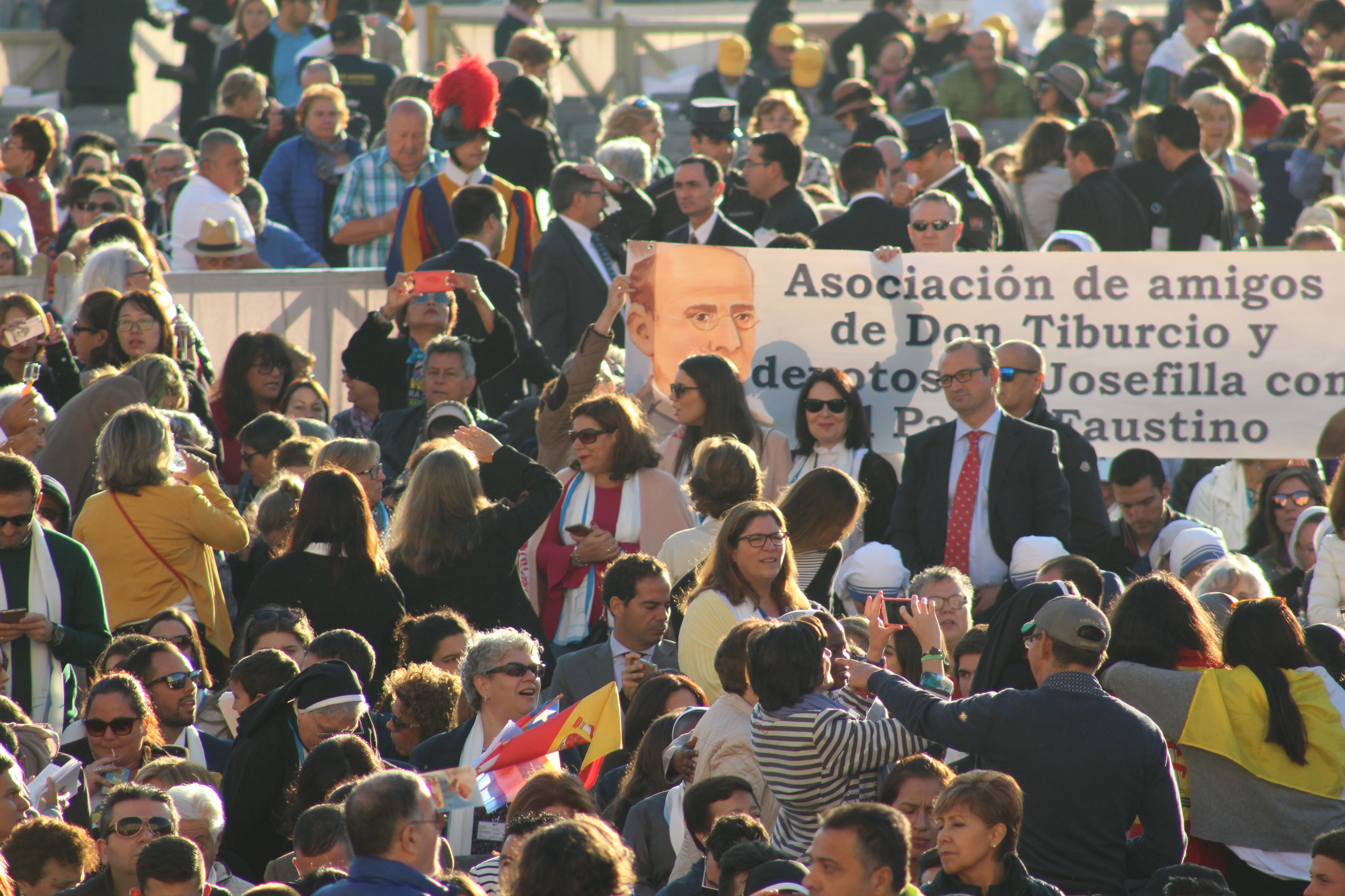 Poco a poco los grupos de religiosas y laicos calasancios llegados desde España, América, África e India hemos ido ocupando nuestro lugar en la plaza ya presidida por la imagen del nuevo Santo.