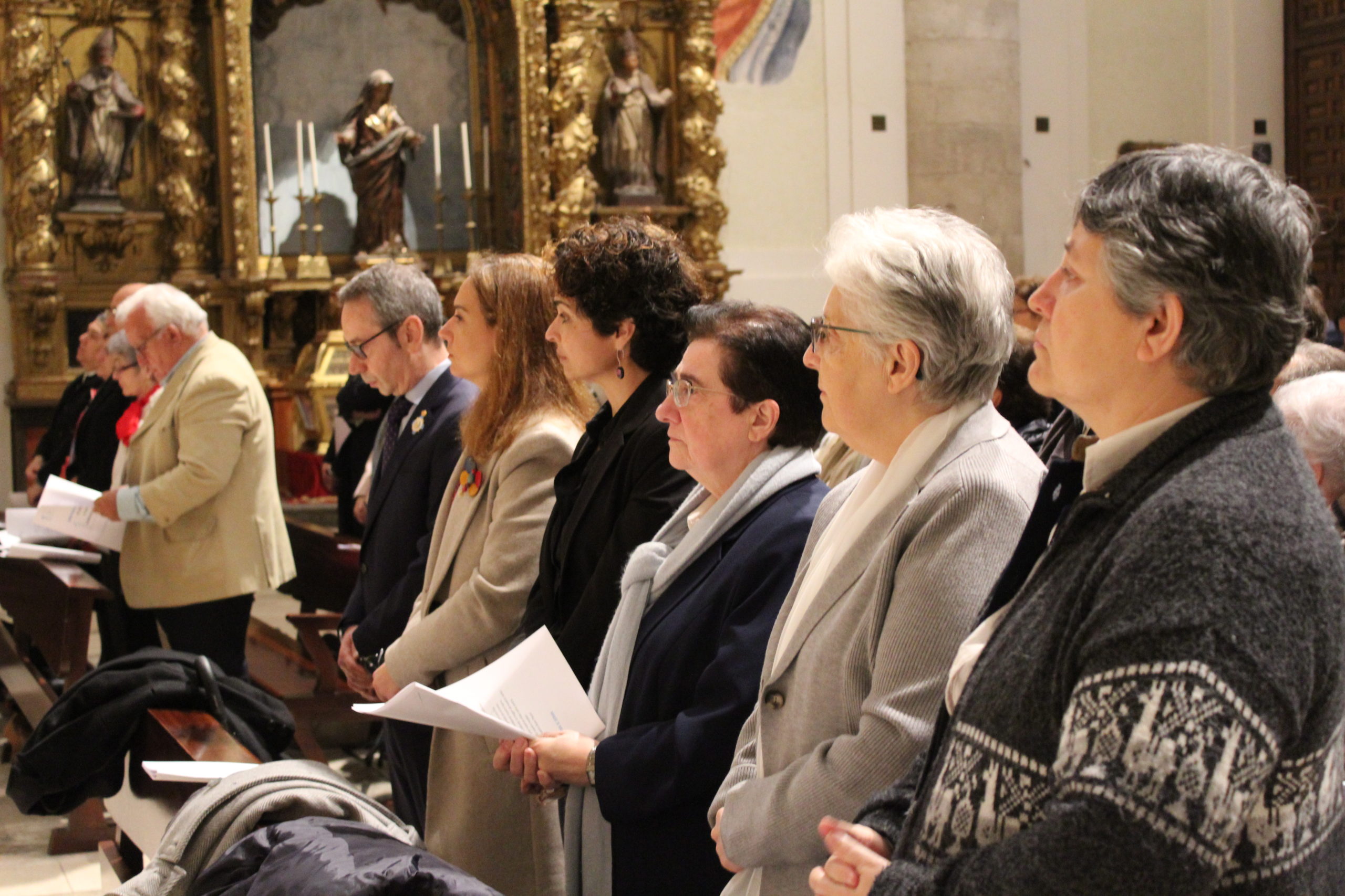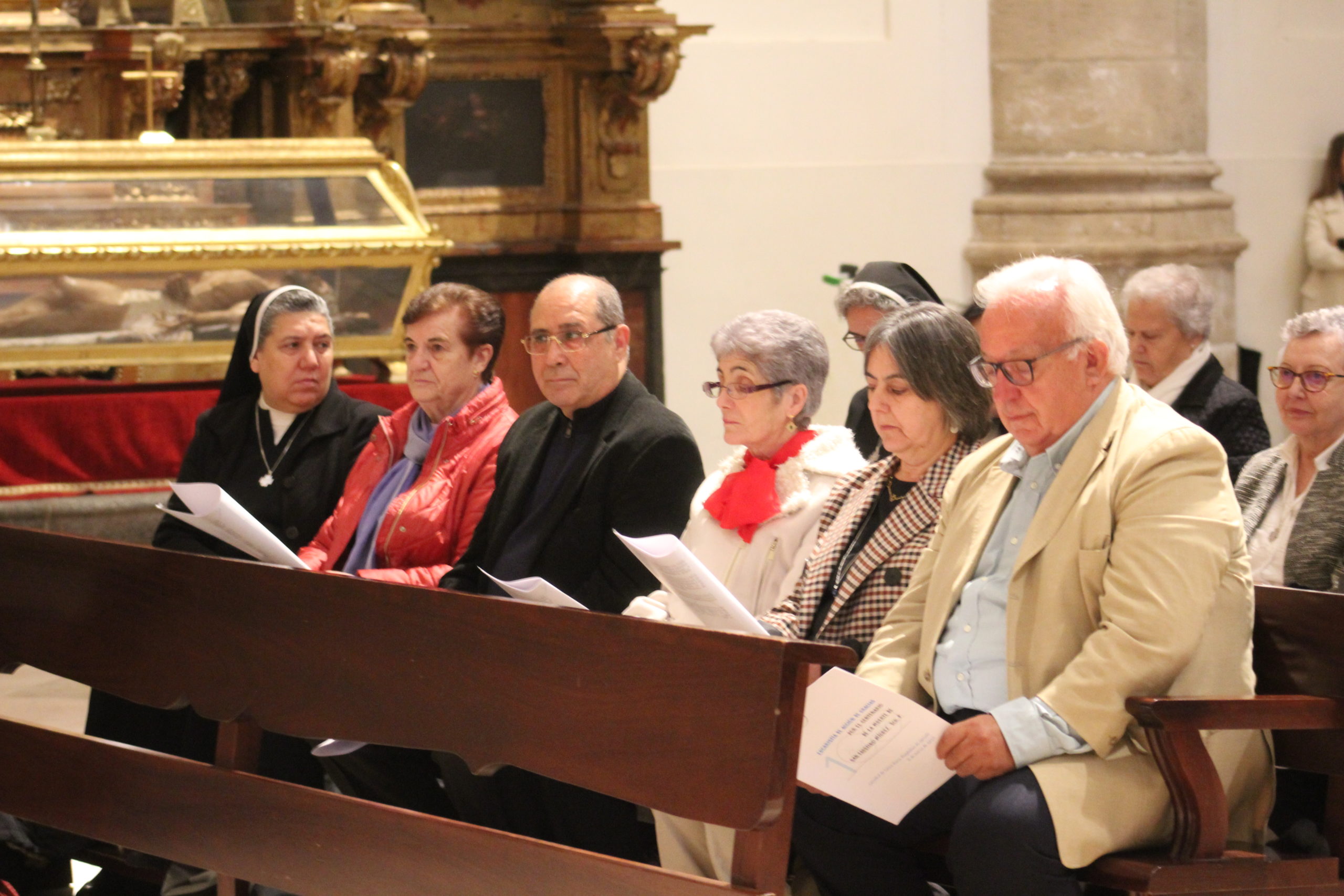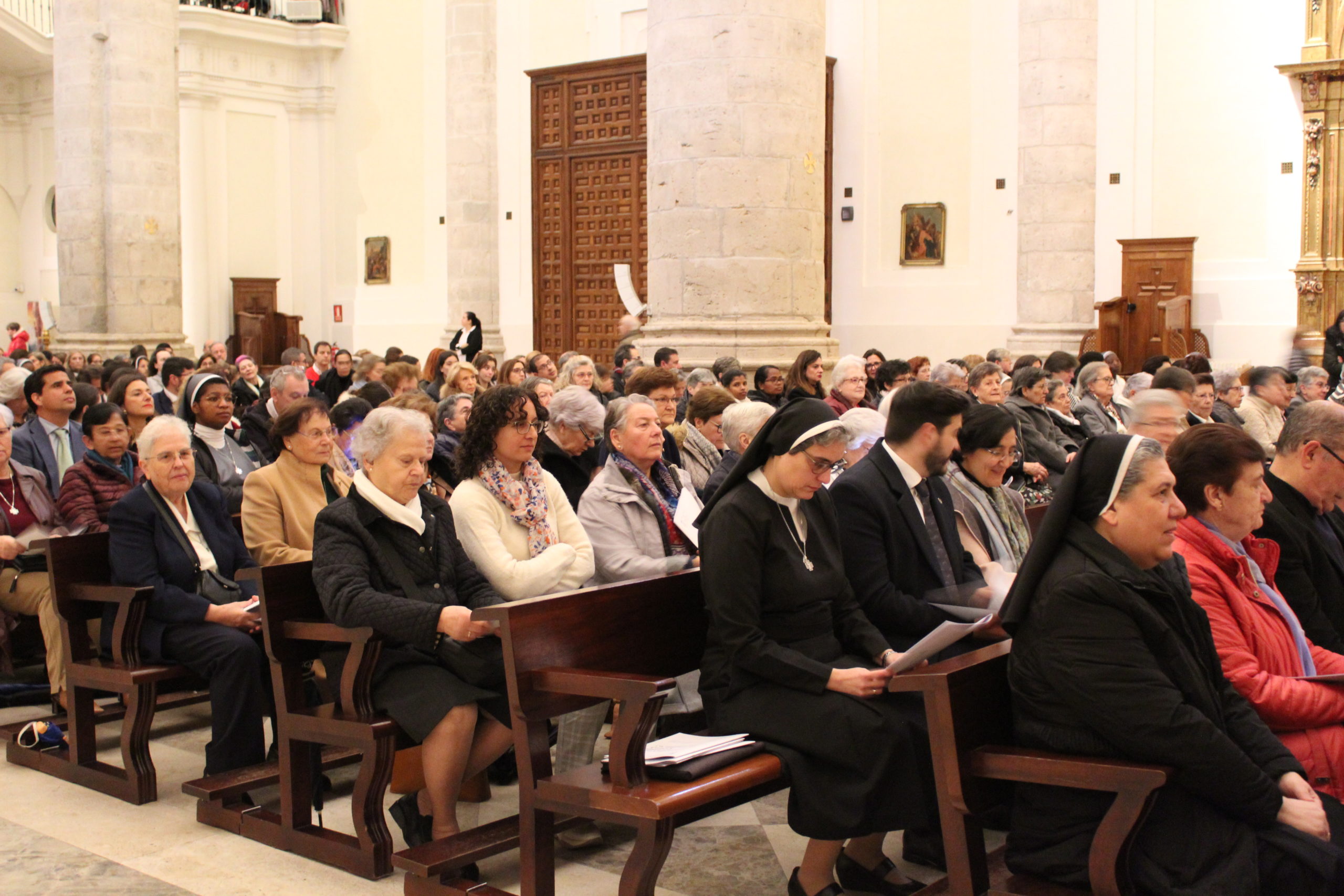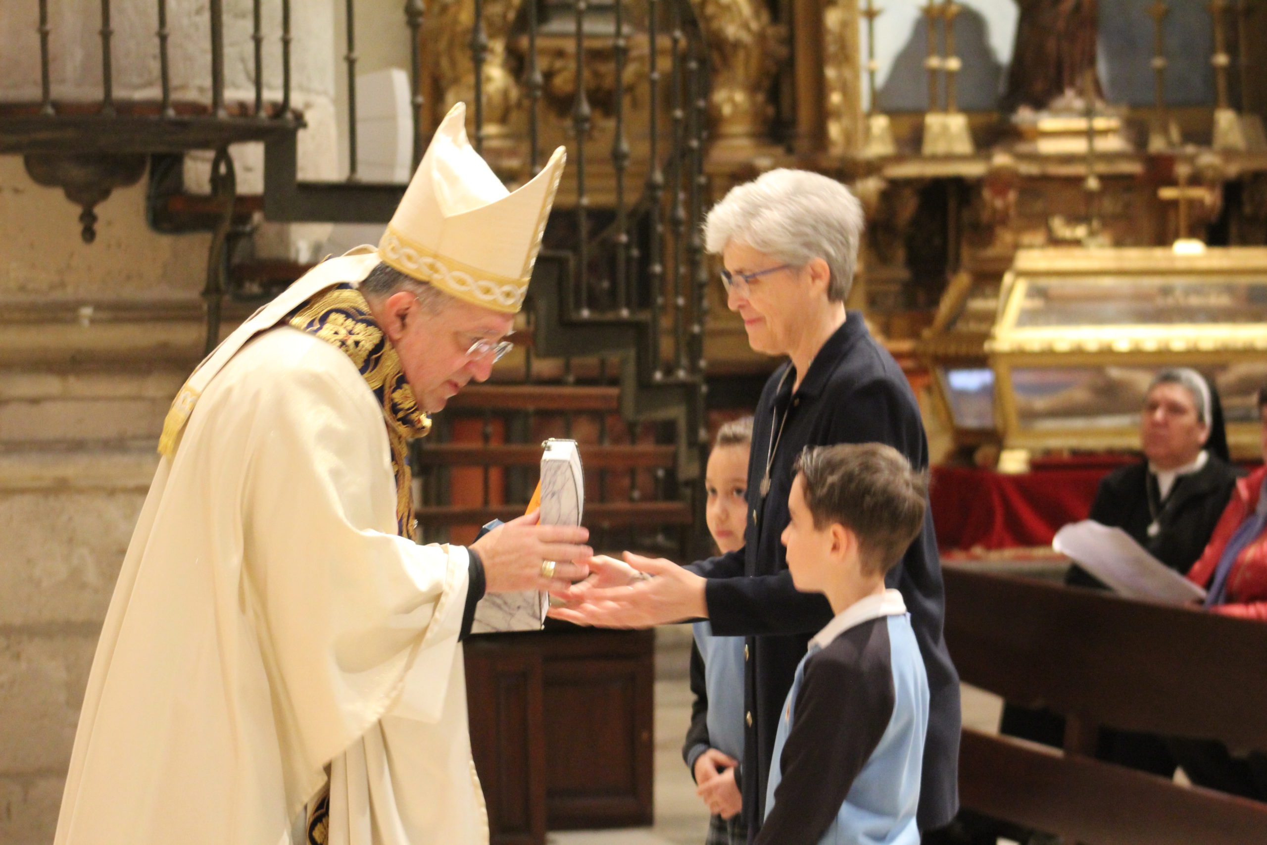 A pesar del clima adverso, la celebración estuvo marcada por una gran participación y alegría. Los actos oficiales comenzaron a las 10:00 h con una solemne Eucaristía en la Catedral de Santa María Magdalena de Getafe, presidida por el obispo D. Ginés García Beltrán. En la ceremonia estuvieron presentes el P. General Pedro Aguado, Escolapios de las comunidades de Getafe y Madrid, sacerdotes diocesanos, autoridades civiles, representantes de la Iglesia local y de la Hermandad de Nuestra Señora de los Ángeles, diversas congregaciones calasancias, el Equipo del Gobierno General del Instituto, las Delegadas de los tres Sectores del Instituto, religiosas y laicos calasancios, alumnos, profesores y familias. El coro del Colegio Divina Pastora acompañó la celebración con interpretaciones musicales llenas de sensibilidad y emoción.