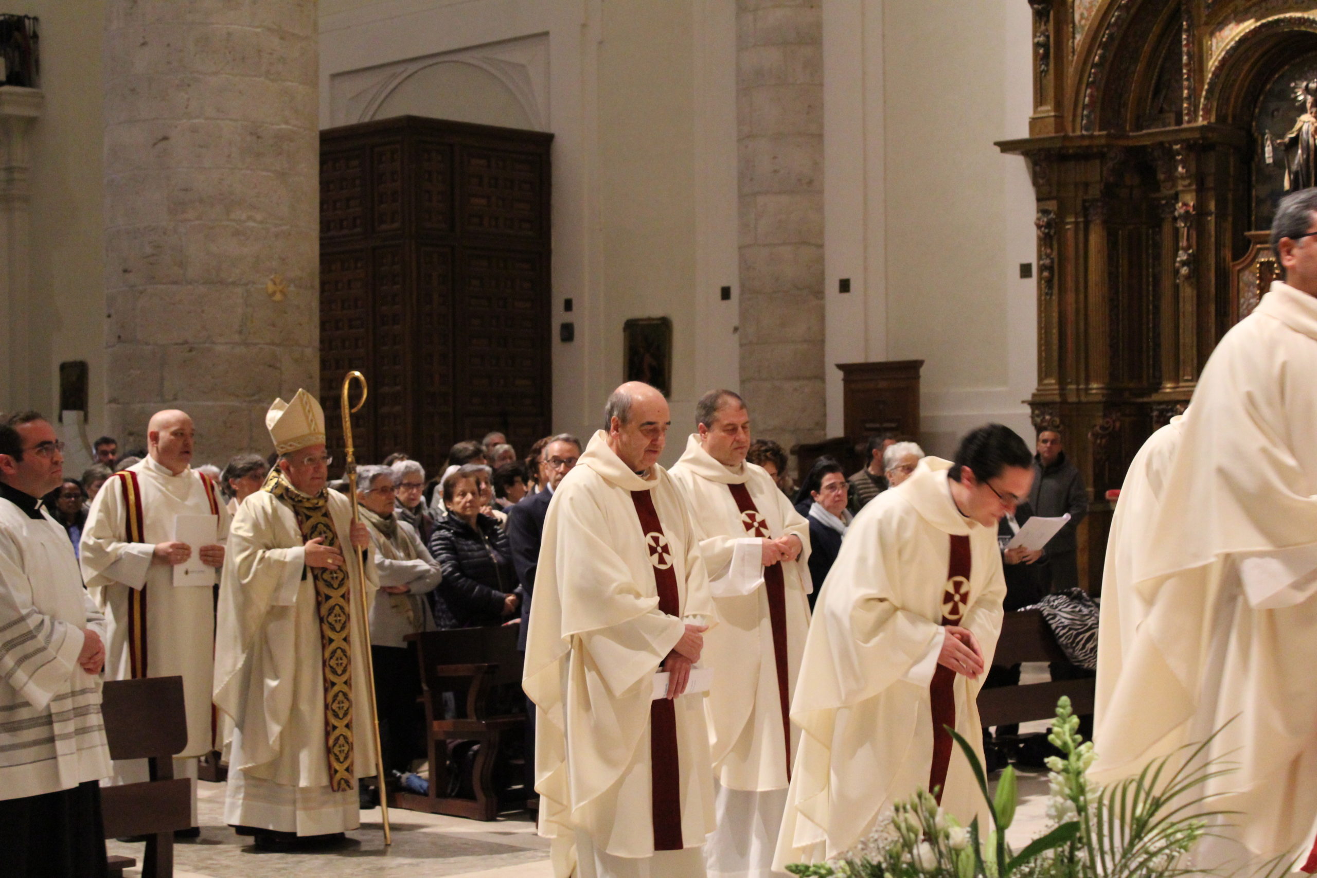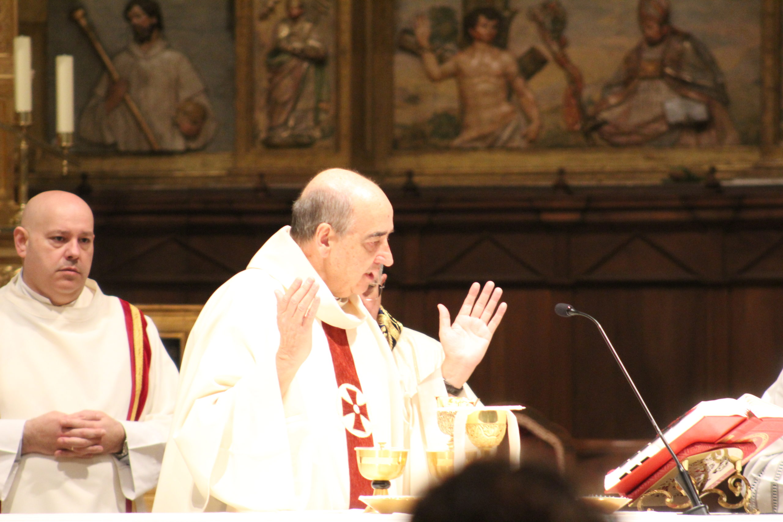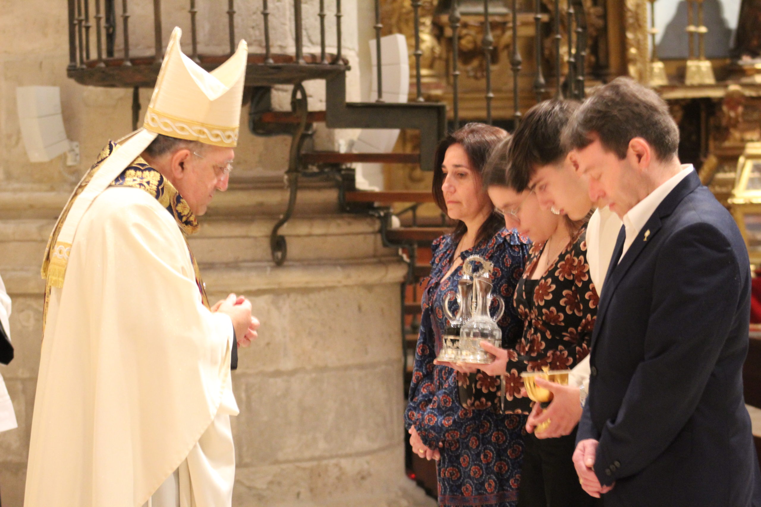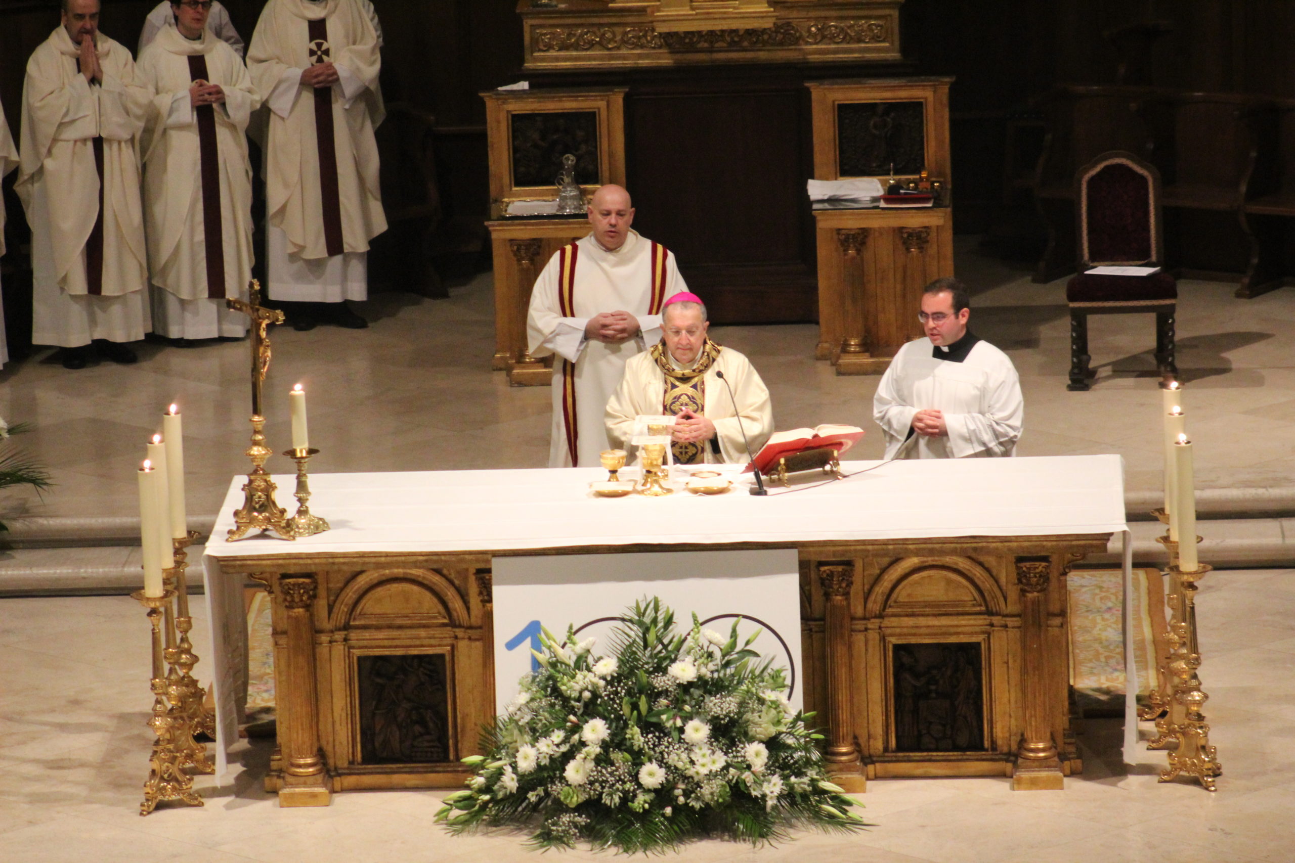 A pesar del clima adverso, la celebración estuvo marcada por una gran participación y alegría. Los actos oficiales comenzaron a las 10:00 h con una solemne Eucaristía en la Catedral de Santa María Magdalena de Getafe, presidida por el obispo D. Ginés García Beltrán. En la ceremonia estuvieron presentes el P. General Pedro Aguado, Escolapios de las comunidades de Getafe y Madrid, sacerdotes diocesanos, autoridades civiles, representantes de la Iglesia local y de la Hermandad de Nuestra Señora de los Ángeles, diversas congregaciones calasancias, el Equipo del Gobierno General del Instituto, las Delegadas de los tres Sectores del Instituto, religiosas y laicos calasancios, alumnos, profesores y familias. El coro del Colegio Divina Pastora acompañó la celebración con interpretaciones musicales llenas de sensibilidad y emoción.