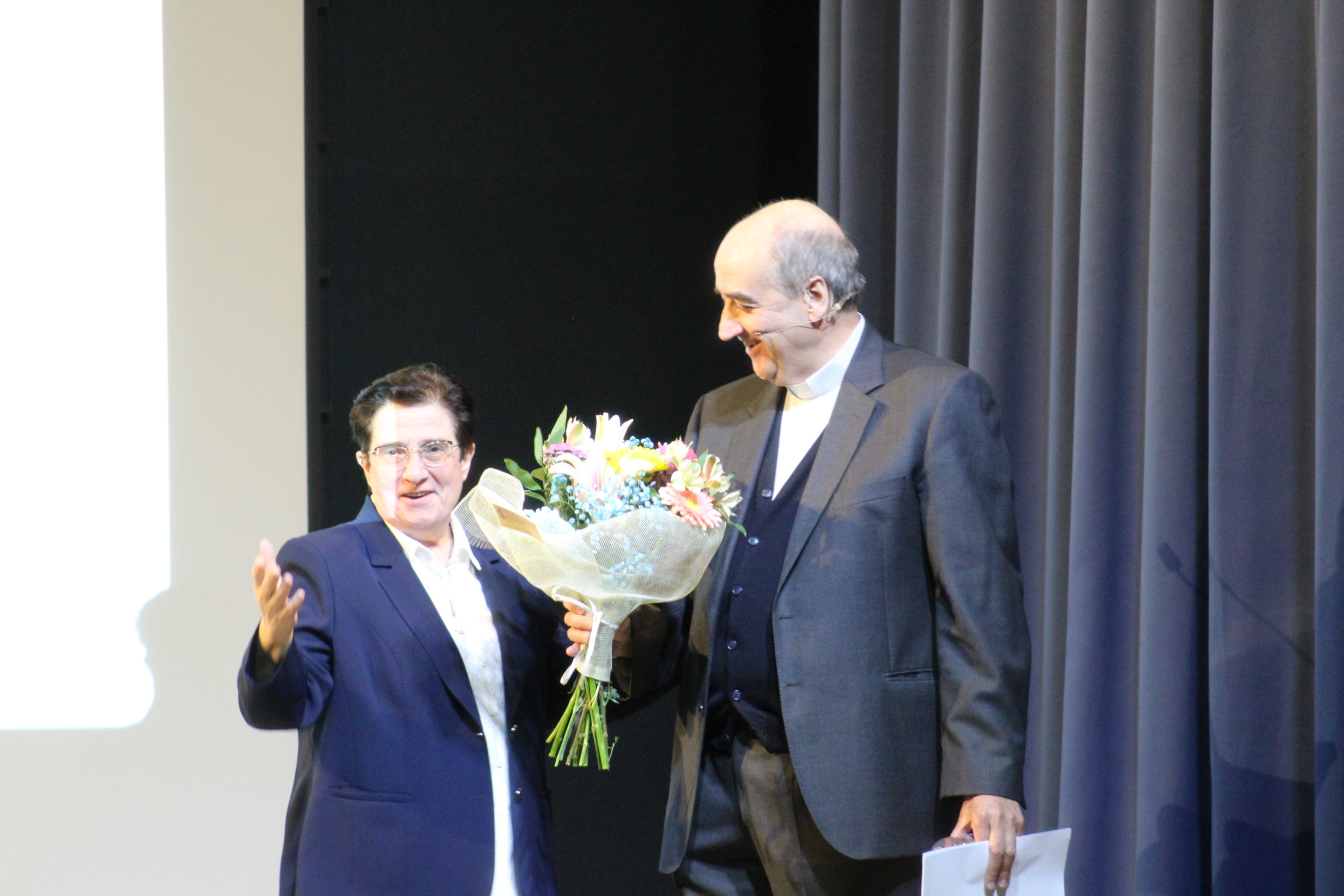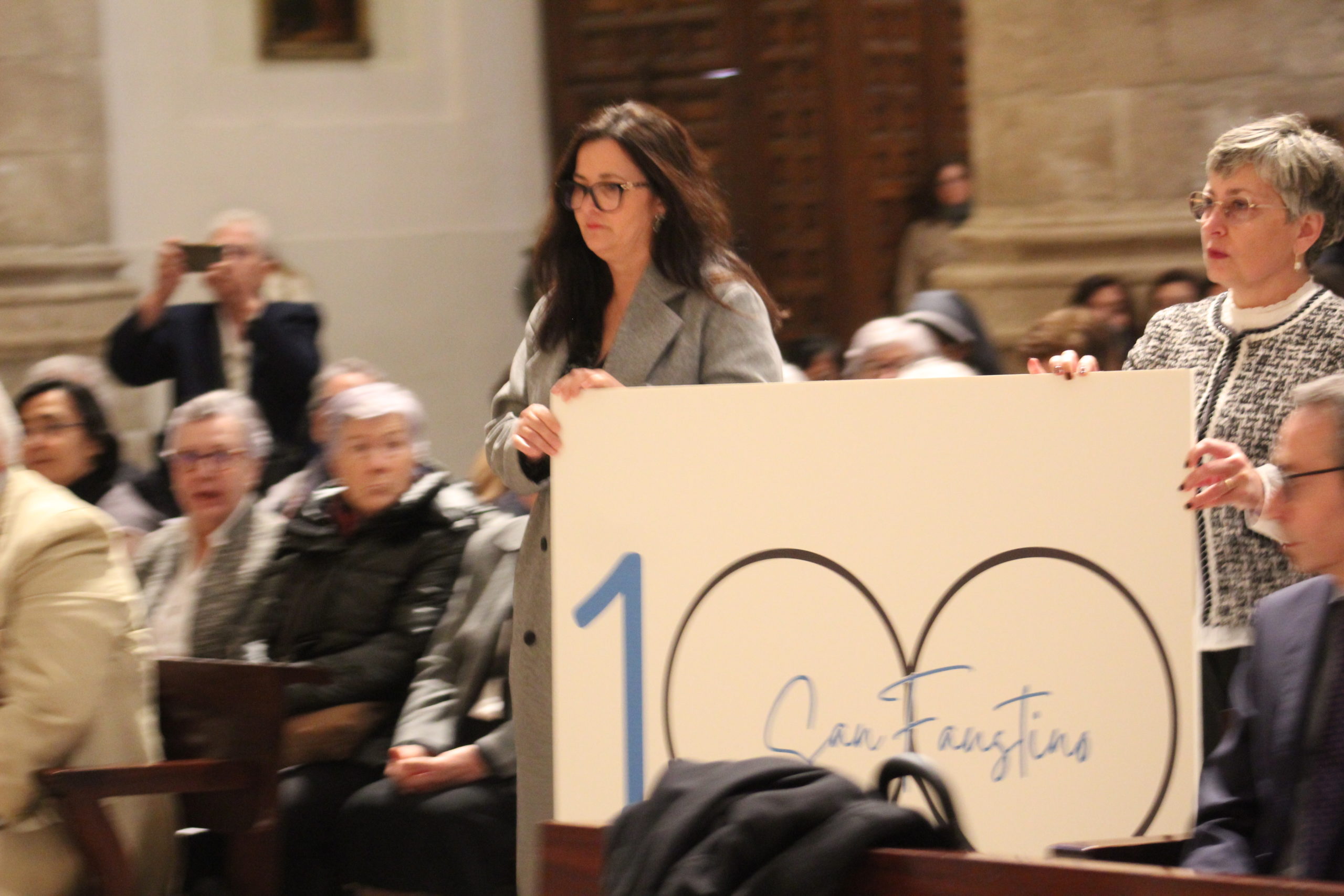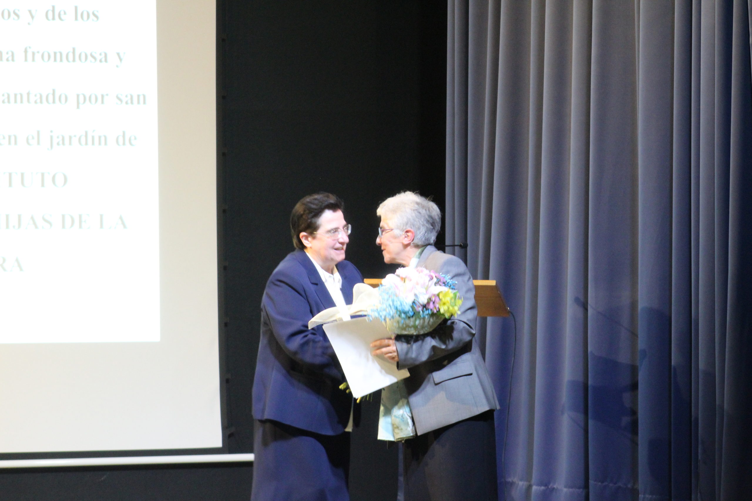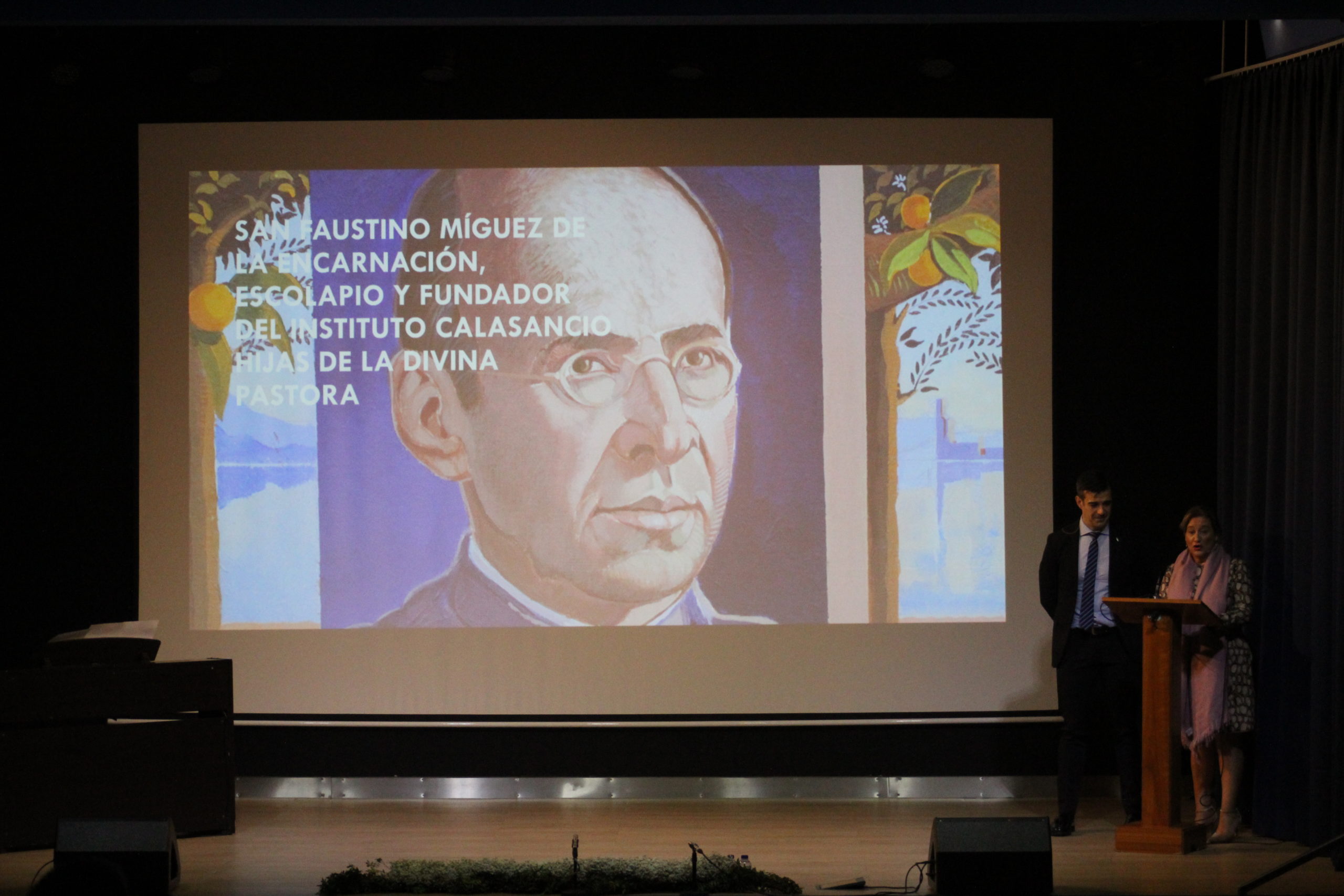 Tras la Eucaristía, los asistentes compartieron un ágape en un ambiente fraterno, marcado por abrazos, sonrisas y encuentros. A las 12:30 h, el Salón de Actos del Colegio de los Padres Escolapios acogió un acto cultural que enriqueció la conmemoración. La M. general Mª José Sotelo en su saludo inicial recordaba que esta celebración pascual nos llena de gozo y esperanza pues San Faustino fue un hombre del pueblo y para el pueblo que nos transmite “una forma de entender la vida, un modo de relacionarnos y nos ofrece una madre que es Pastora, nos acompaña y nos cuida”. A continuación, la alcaldesa de Getafe, Dña. Sara Hernández, saludaba también a los participantes.