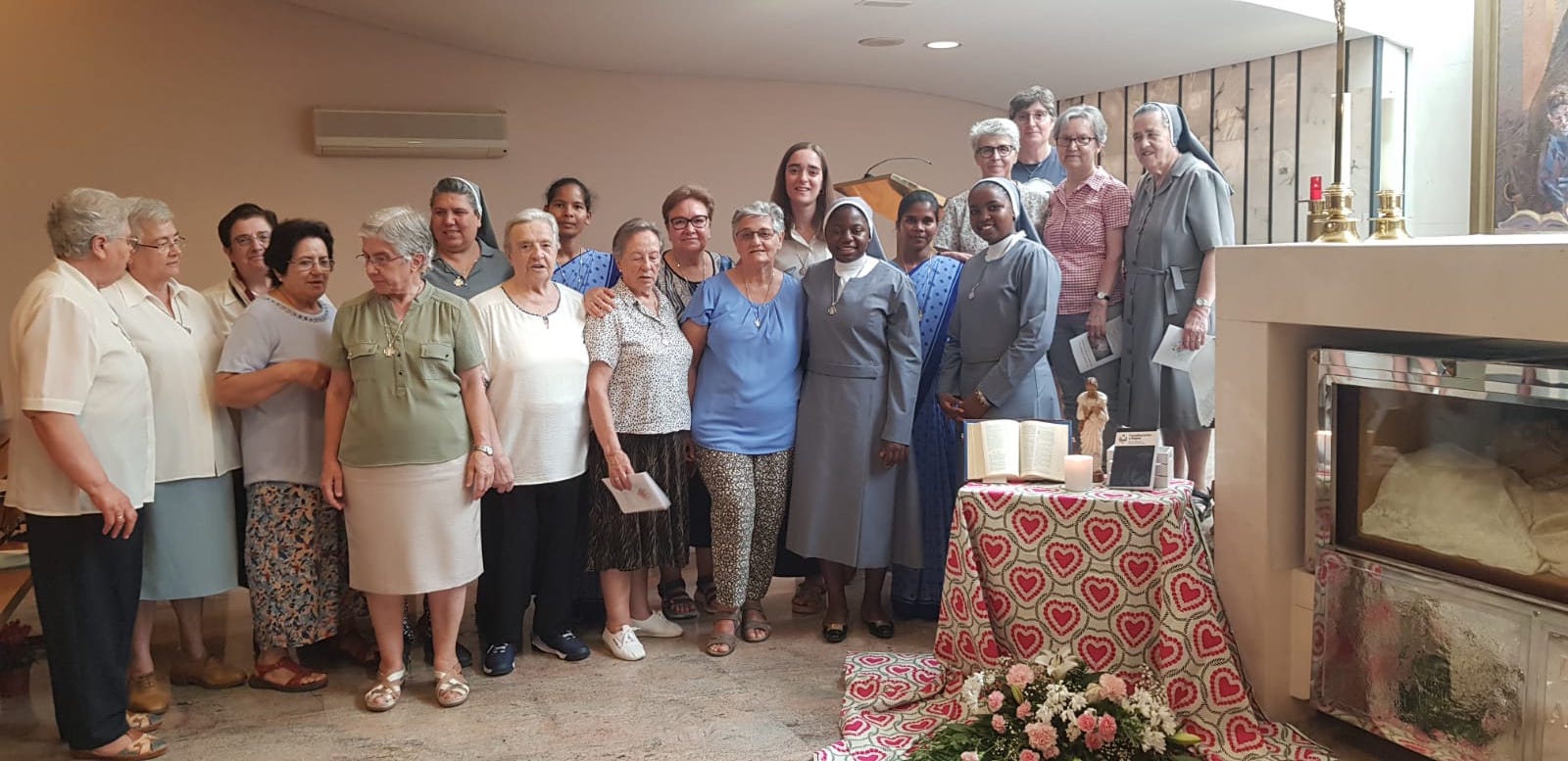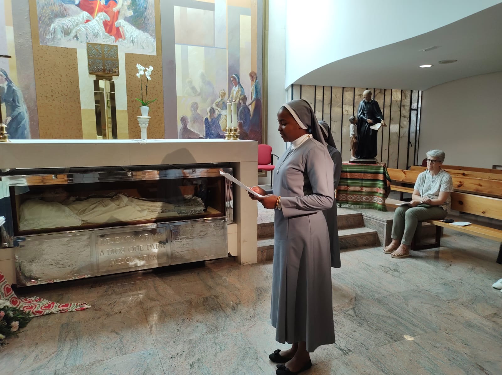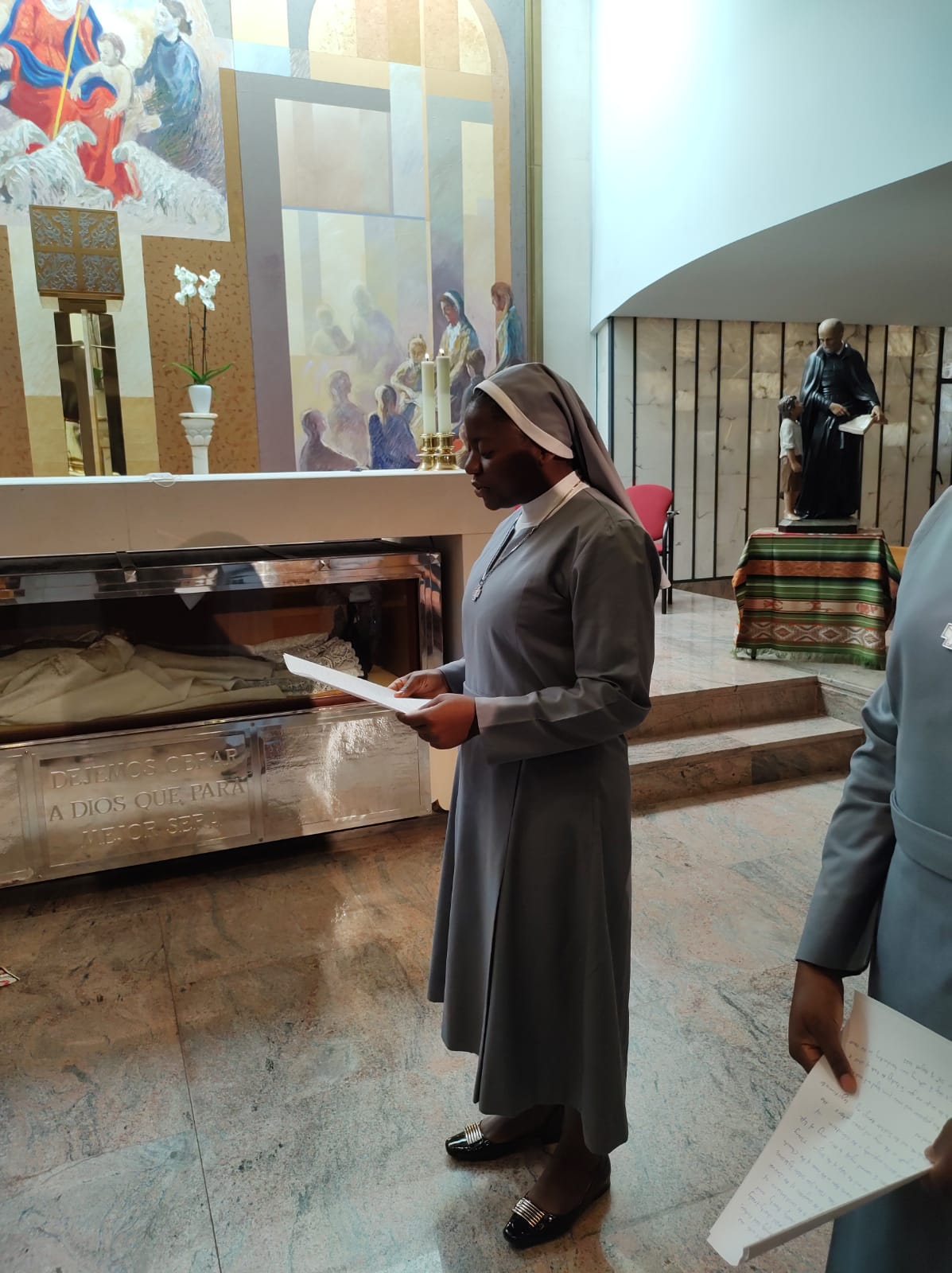 El día 28 en la capilla de san Faustino en Getafe, han realizado su primera renovación de votos las junioras Aidanant Bih Ndum y Sidonie Leinyuy Lukong con el rezo de Tercia. M. Mª José Sotelo ha recibido los votos de nuestras hermanas. En la celebración han acompañado las han acompañado M. Purificación Barreiro y M. Claudia Villarreal del Equipo General, las hermanas de las comunidades del Juniorado y de Getafe, y M. Mª Luisa González y M. Sara Herrero de la comunidad de Pontevedra.