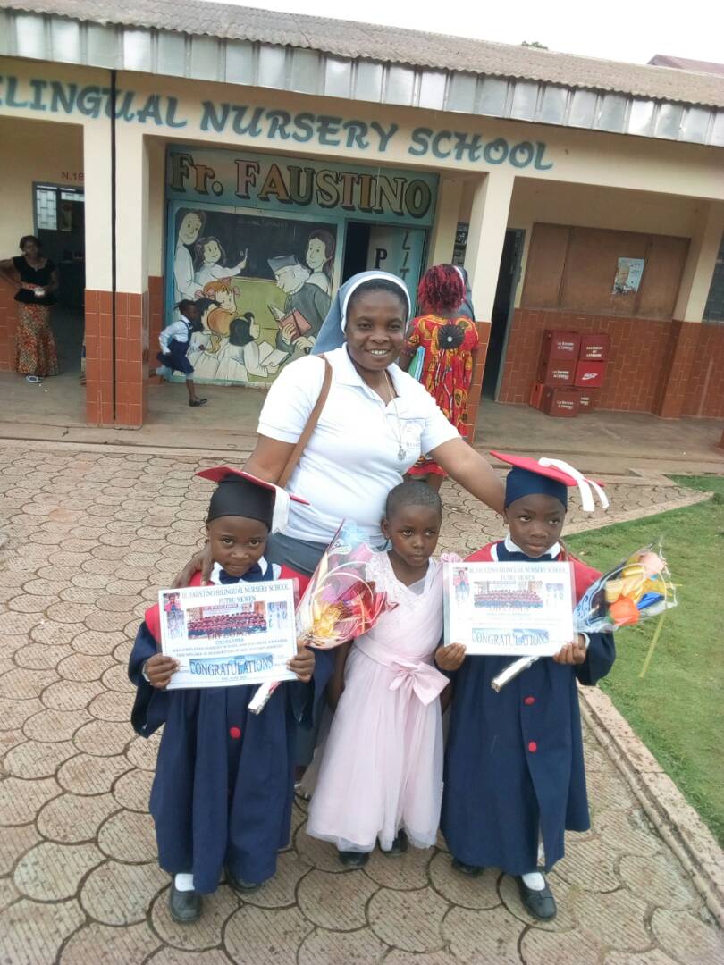 Durante su estancia en Futrú les ha coincidido la graduación de los alumnos de 2º de E. Infantil, en la que se graduaron dos niñas del Hogar; y la Visita Pastoral a la parroquia de San Miguel que está realizando el Obispo auxiliar de la Archidiócesis de Bamenda Mons. Michael Bibi, que también ha visitado a las hermanas y a las niñas del Hogar.
