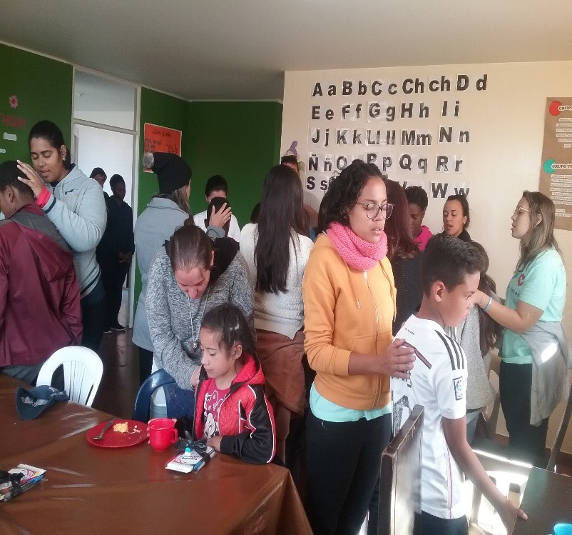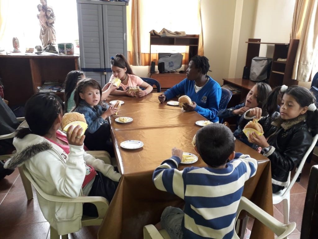 Nuestra misión aquí es brindar a los niños y jóvenes un espacio familiar, de acogida, respeto y fortalecimiento de valores, por medio del comedor, el refuerzo escolar, acompañamiento de tareas, salidas pedagógicas y diálogos formativos. Dentro de este ambiente se reciben visitas de diferentes personas que acuden a conocer nuestro entorno y el trabajo con los niños y jóvenes, realizando con los chicos actividades lúdicas, recreativas, de lectura y talleres de manualidades.